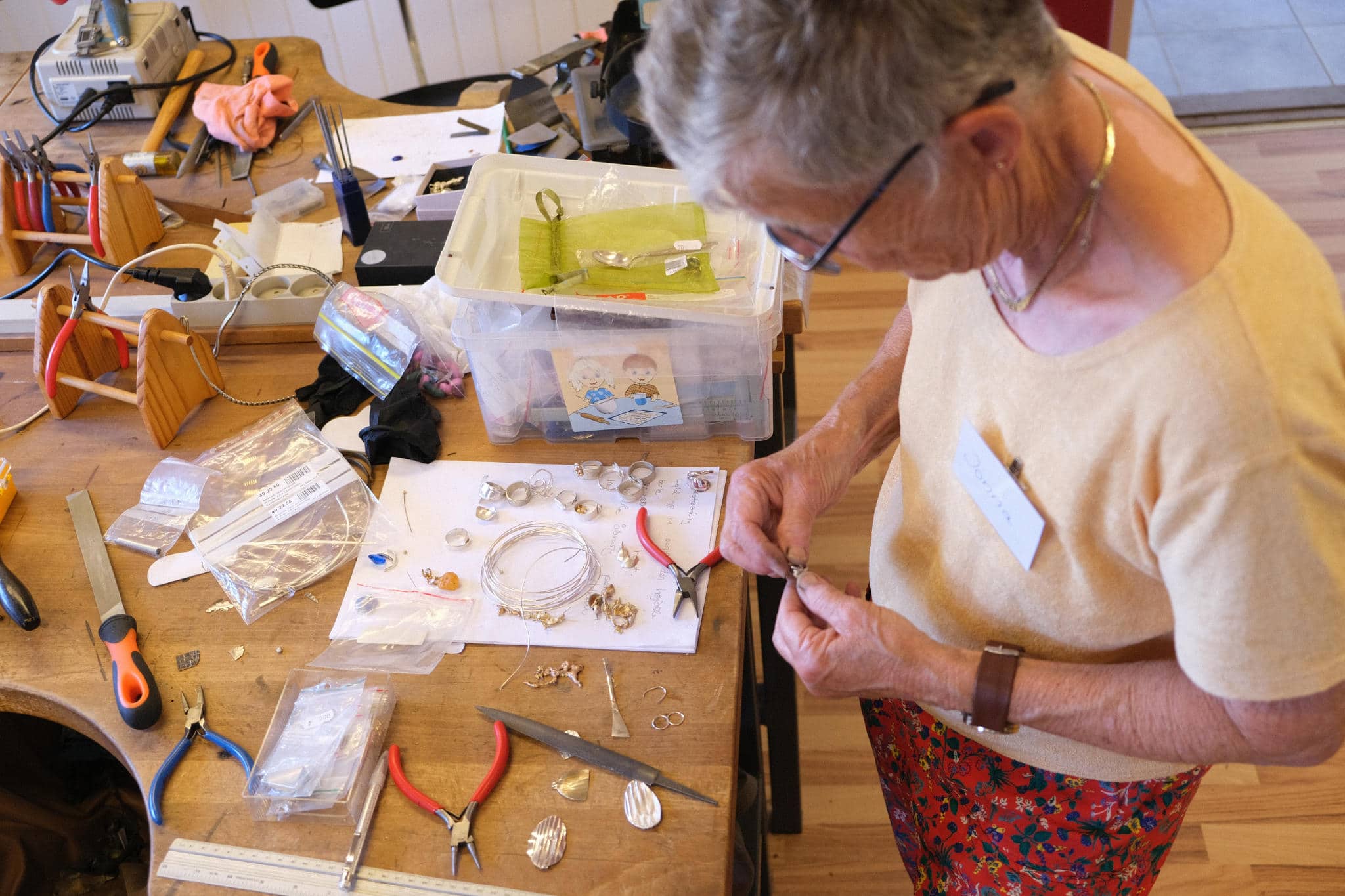 Materialerne til kurset kan du købe på højskolen, og det, skolen ikke har, kan hurtigt skaffes. Men hvis du har smykkesten, sølv og guld, andet materiale og værktøj, som du gerne vil bruge, er du velkommen til at tage det med.